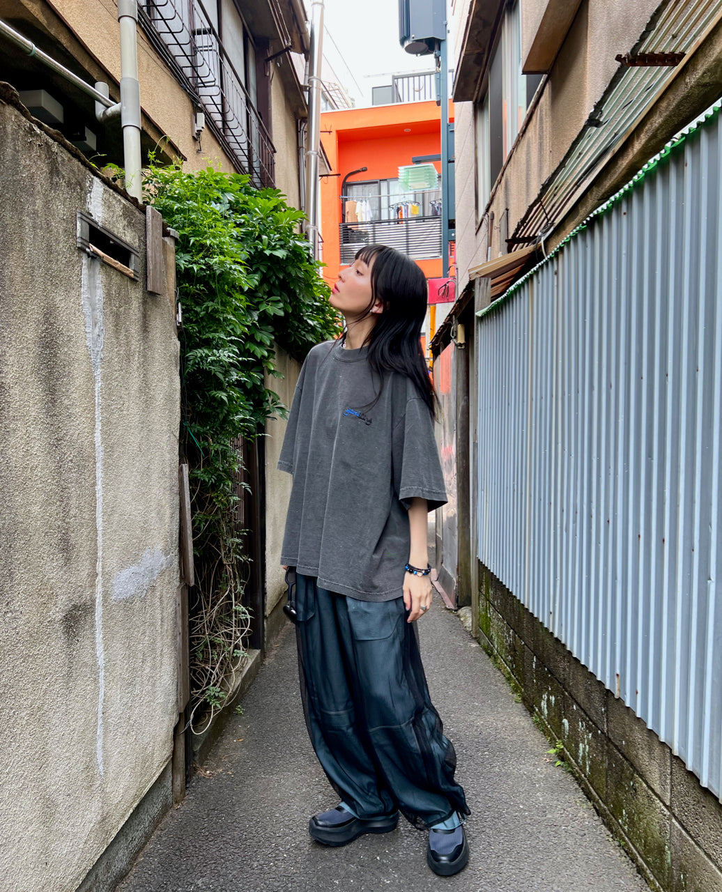 着丈はジャスト、身幅たっぷりで袖が下がるシルエット。