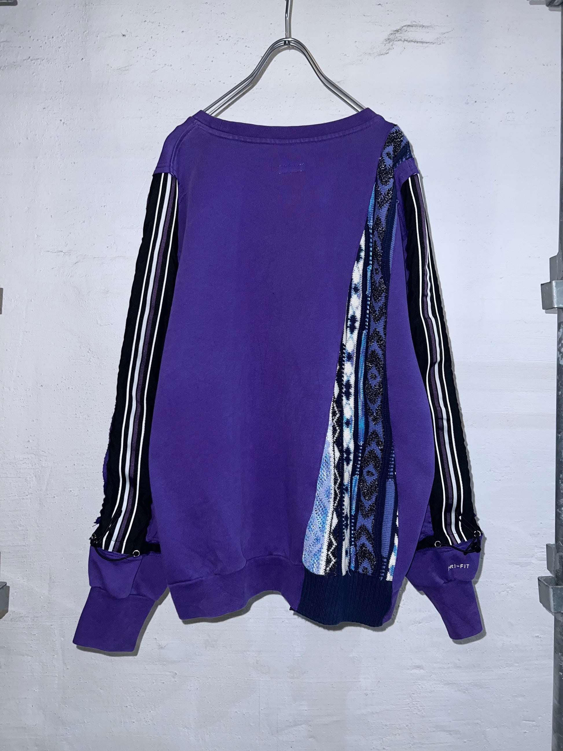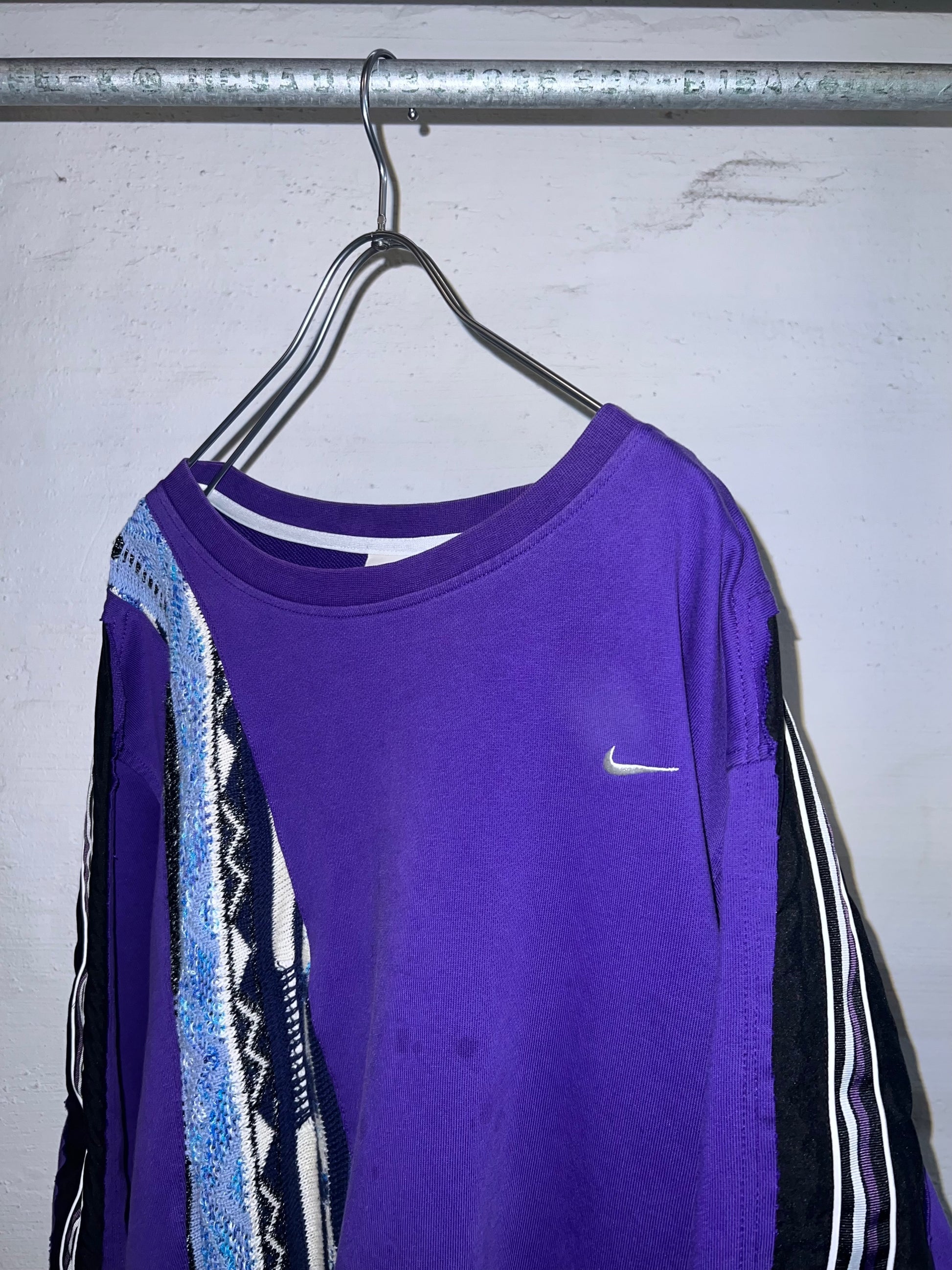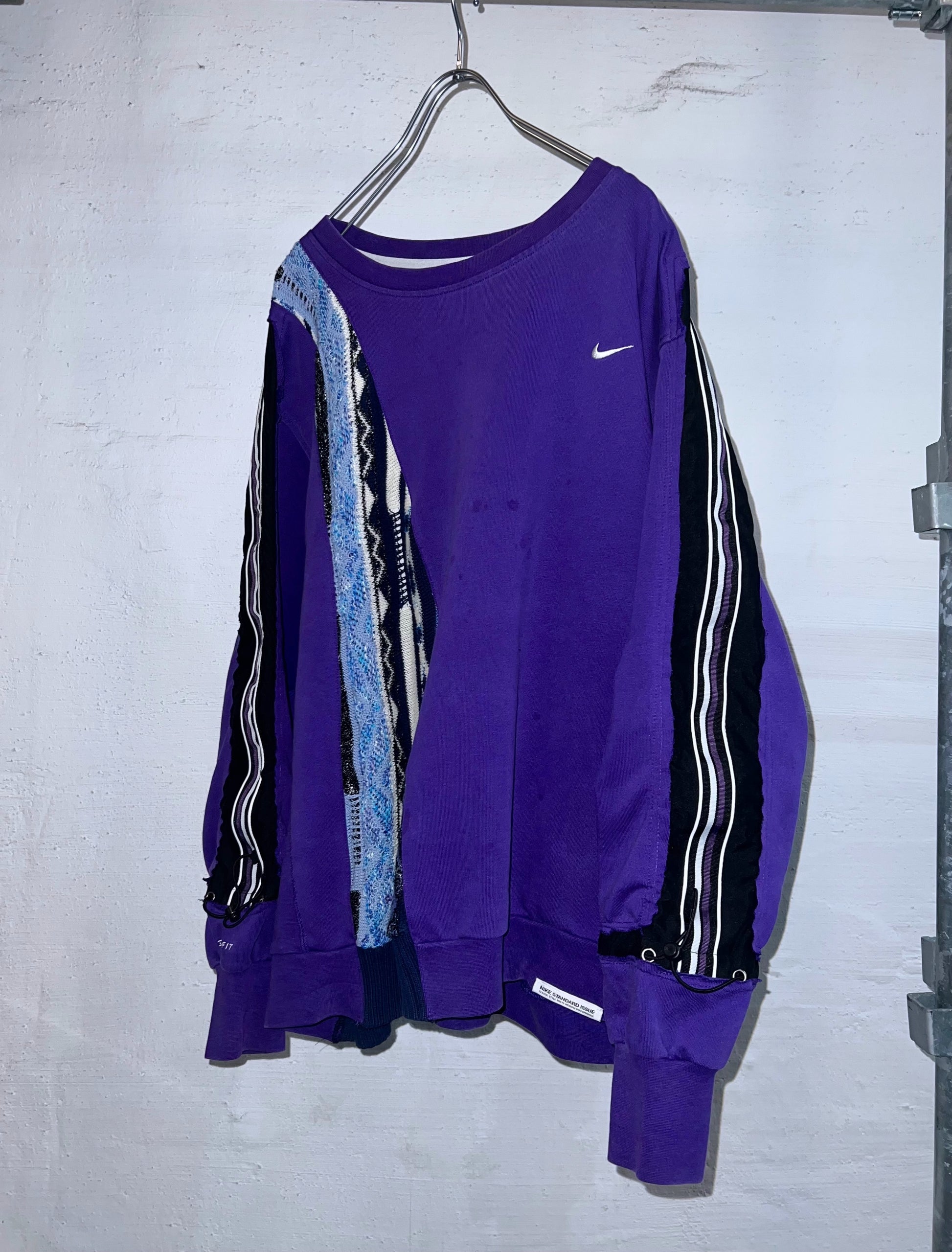 NIKEスウェットと、クージースタイルセーター、サイドラインパンツの異なるテクスチャーを大胆に再構築しています。