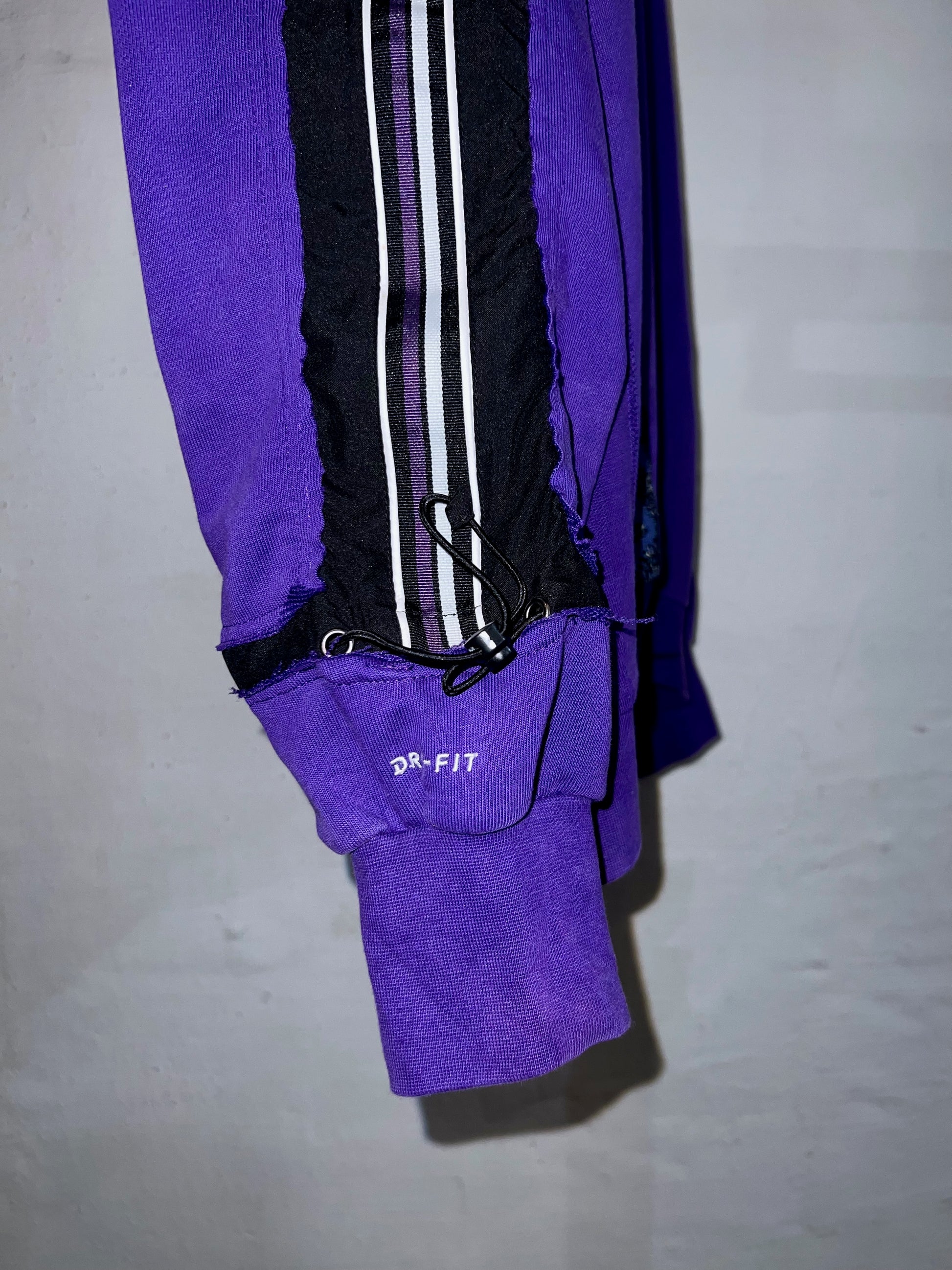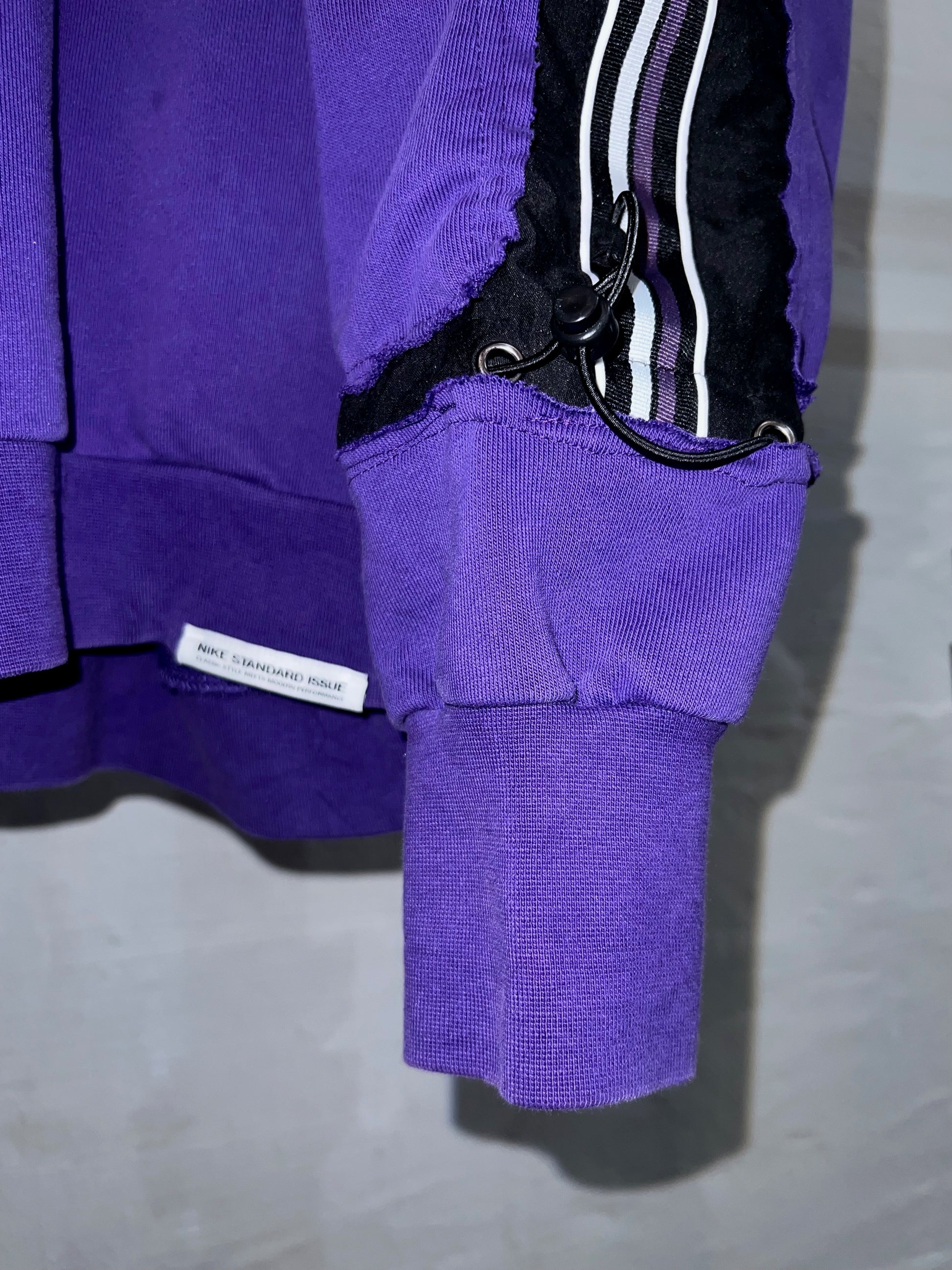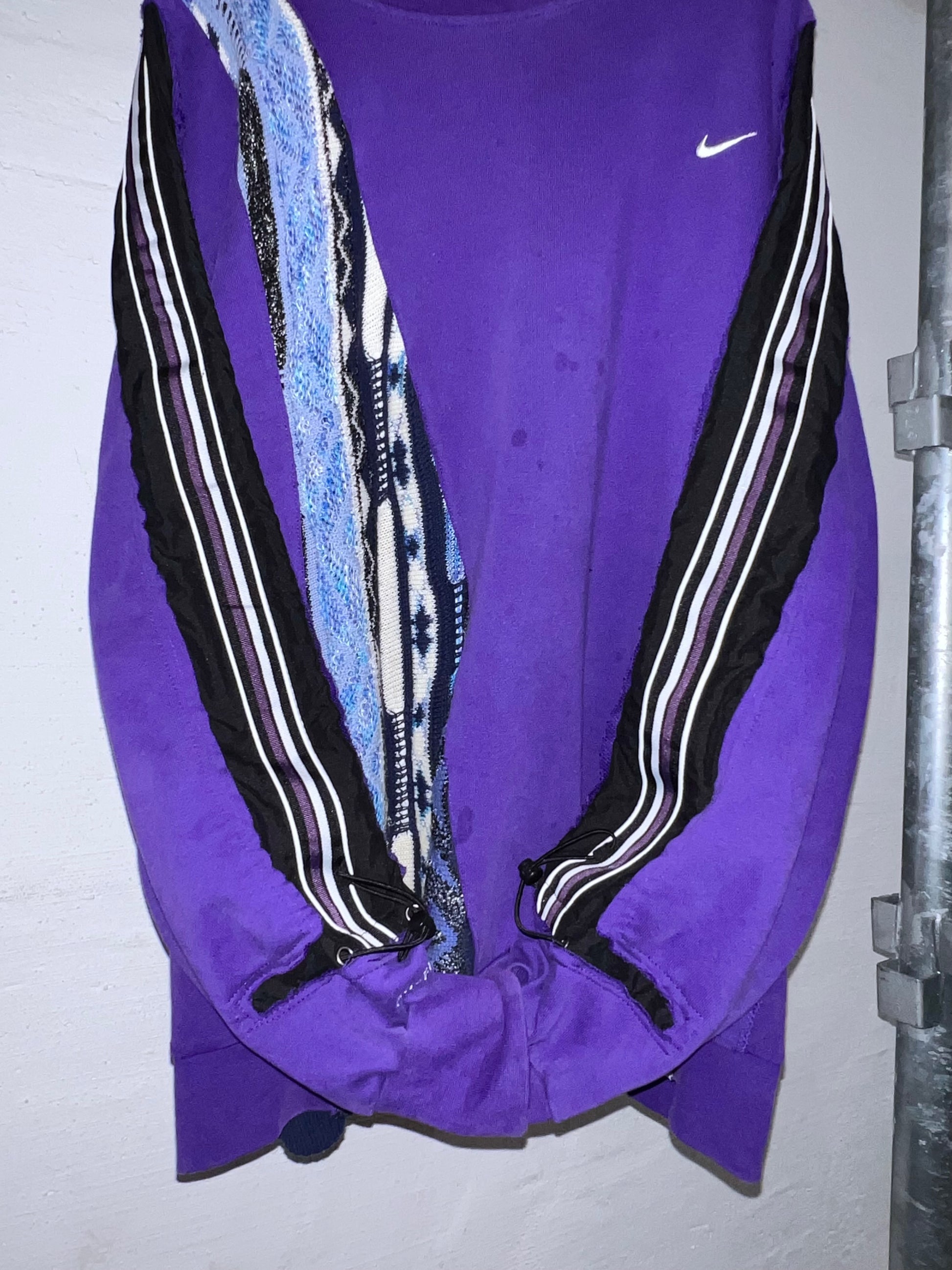 NIKEスウェットと、クージースタイルセーター、サイドラインパンツの異なるテクスチャーを大胆に再構築しています。