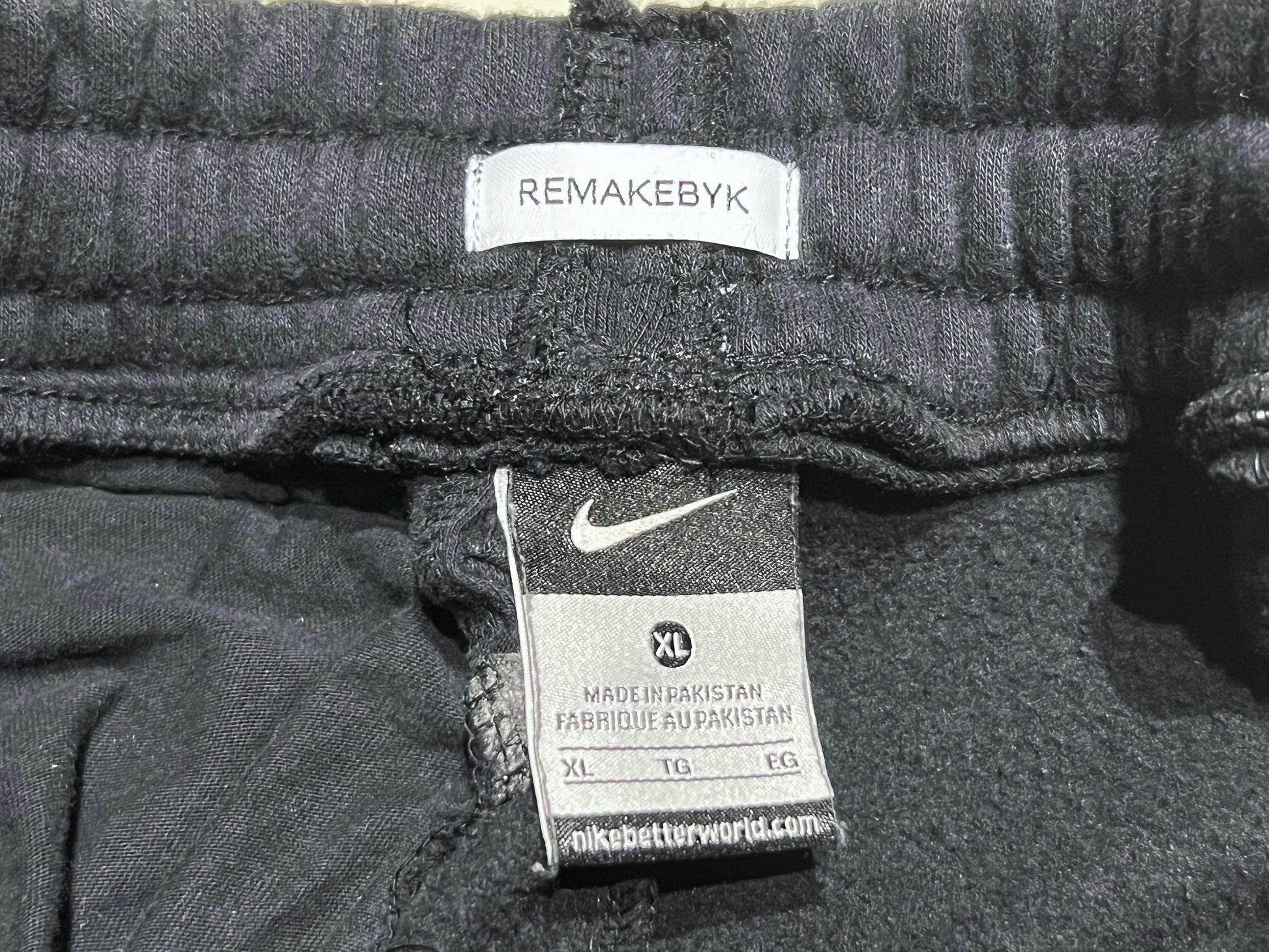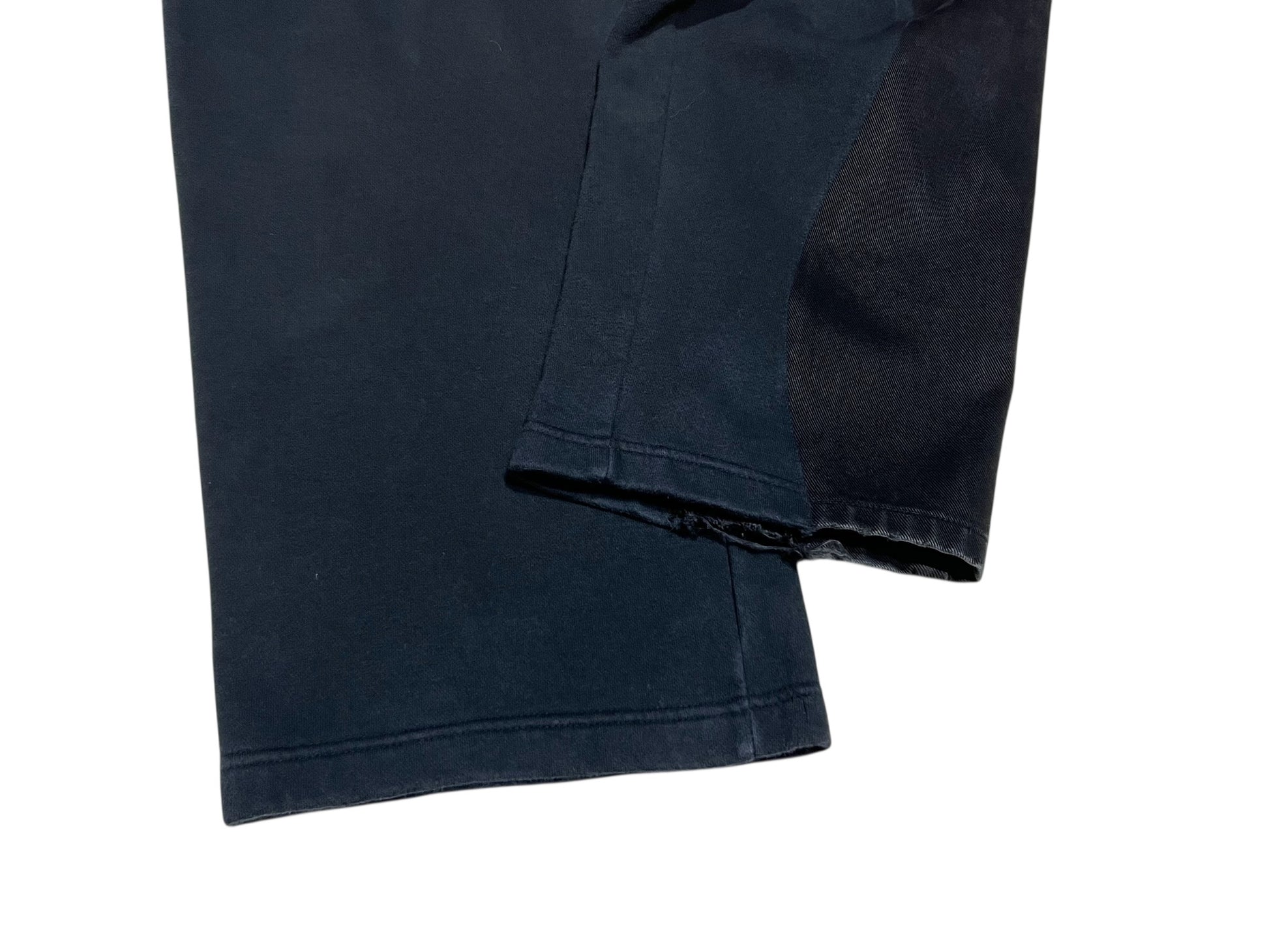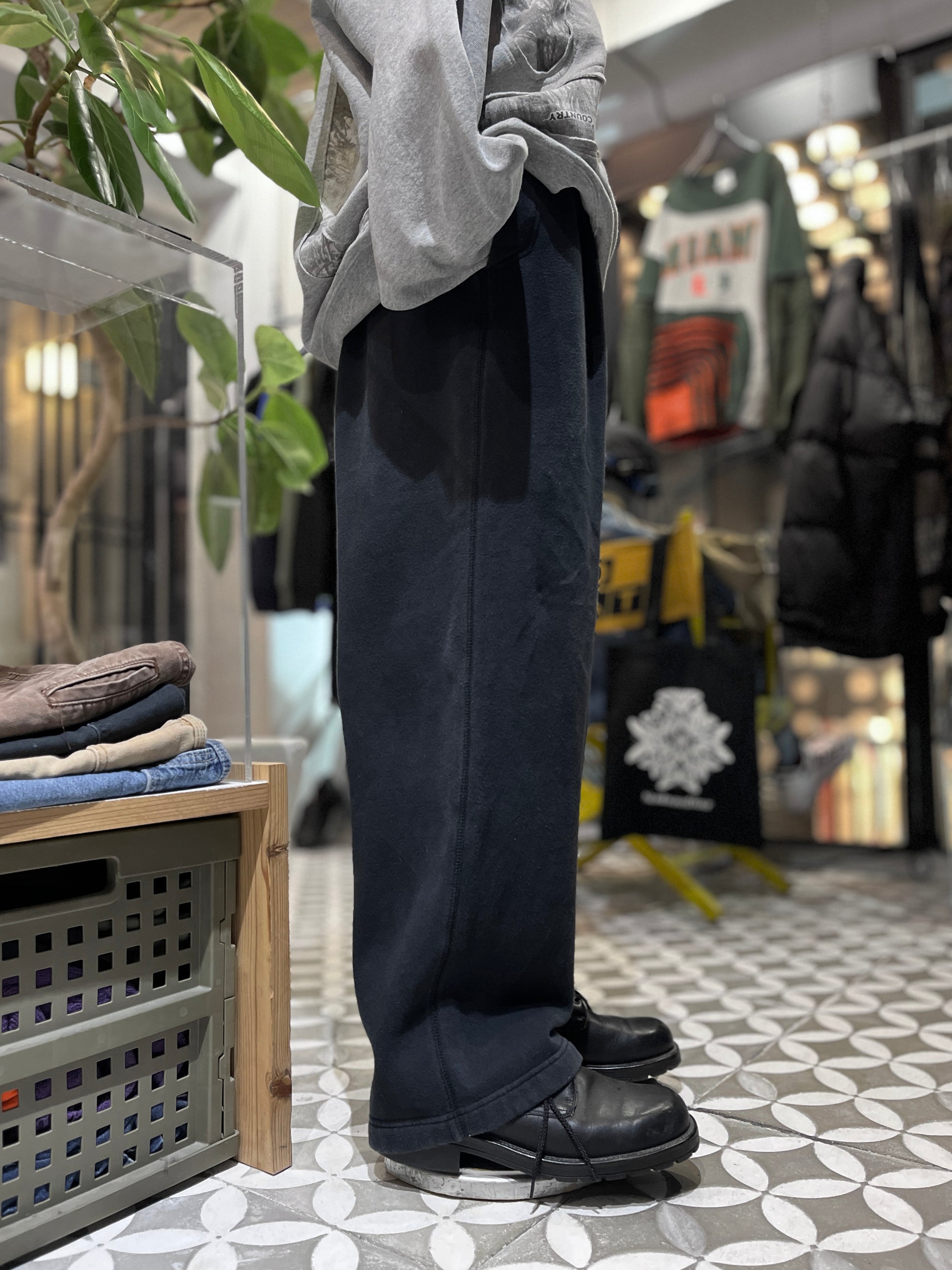 ヴィンテージのNIKEスウェットパンツと、PEPEのバギージーンズの異なるテクスチャーを大胆に再構築しています。