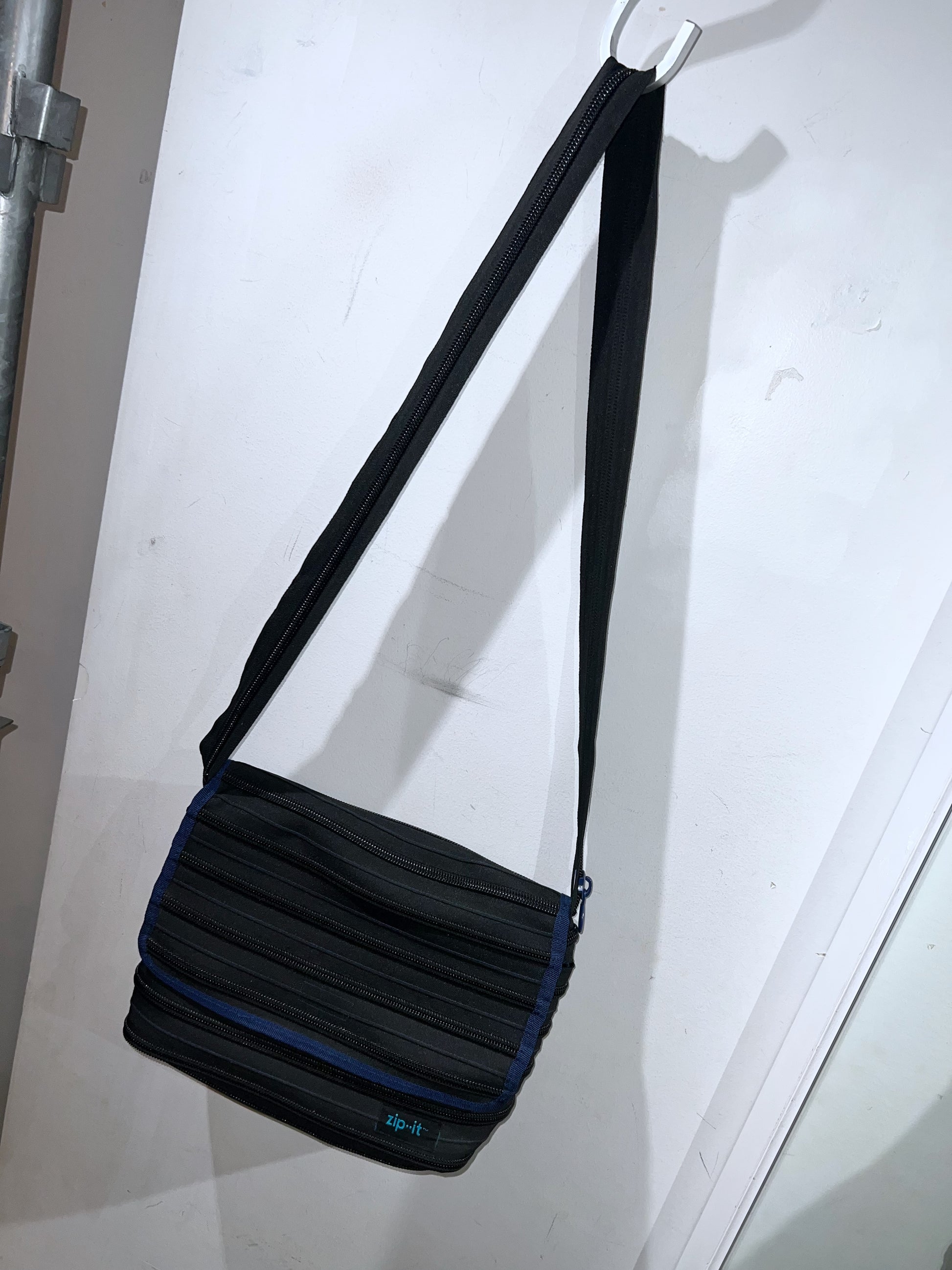 何本ものジッパーがボーダーデザインとなった、ギミック満載のショルダーバッグ。