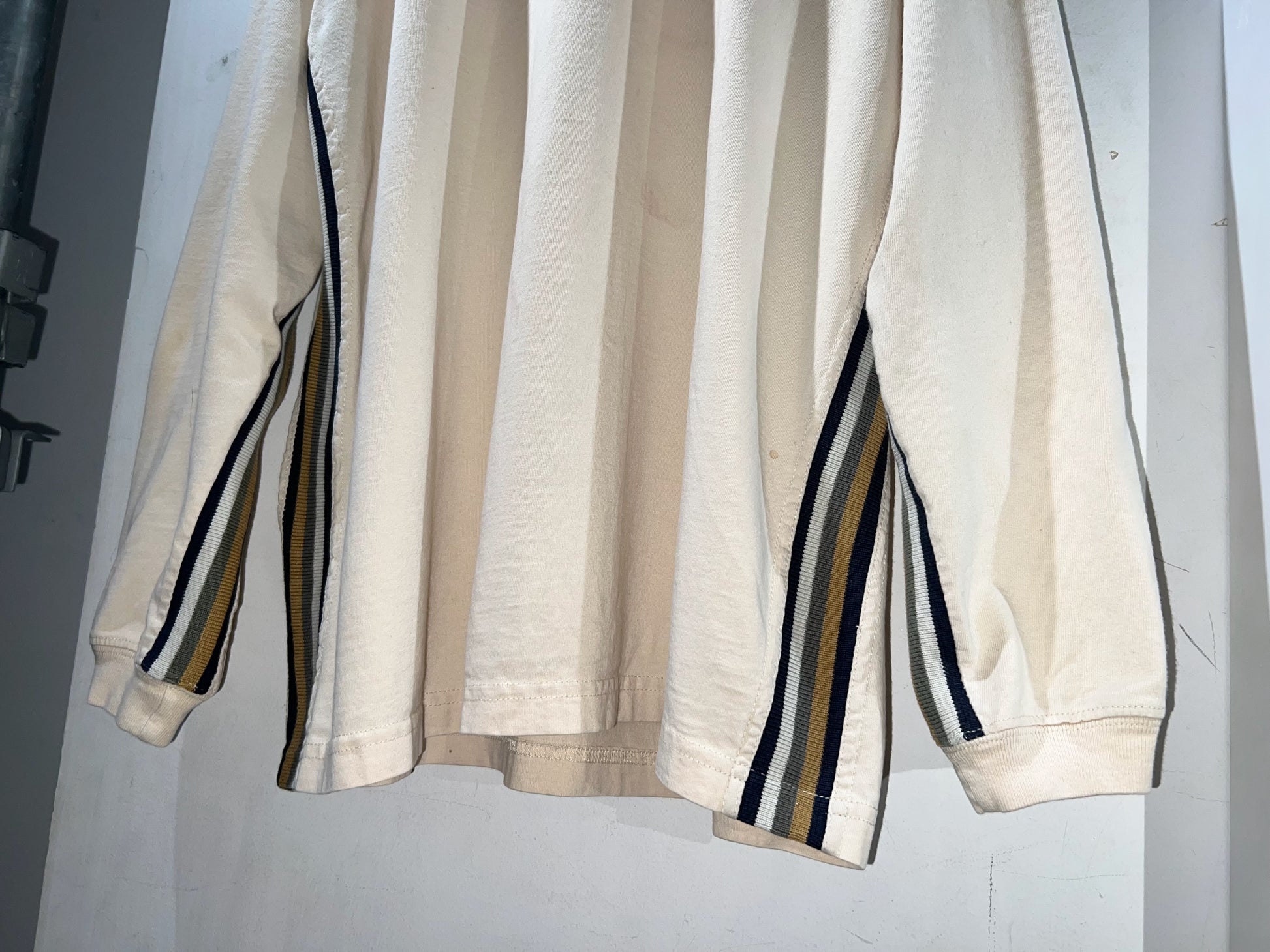 両サイドから袖にかけて走るストライプの切り替えが入った、心憎いデザイン。