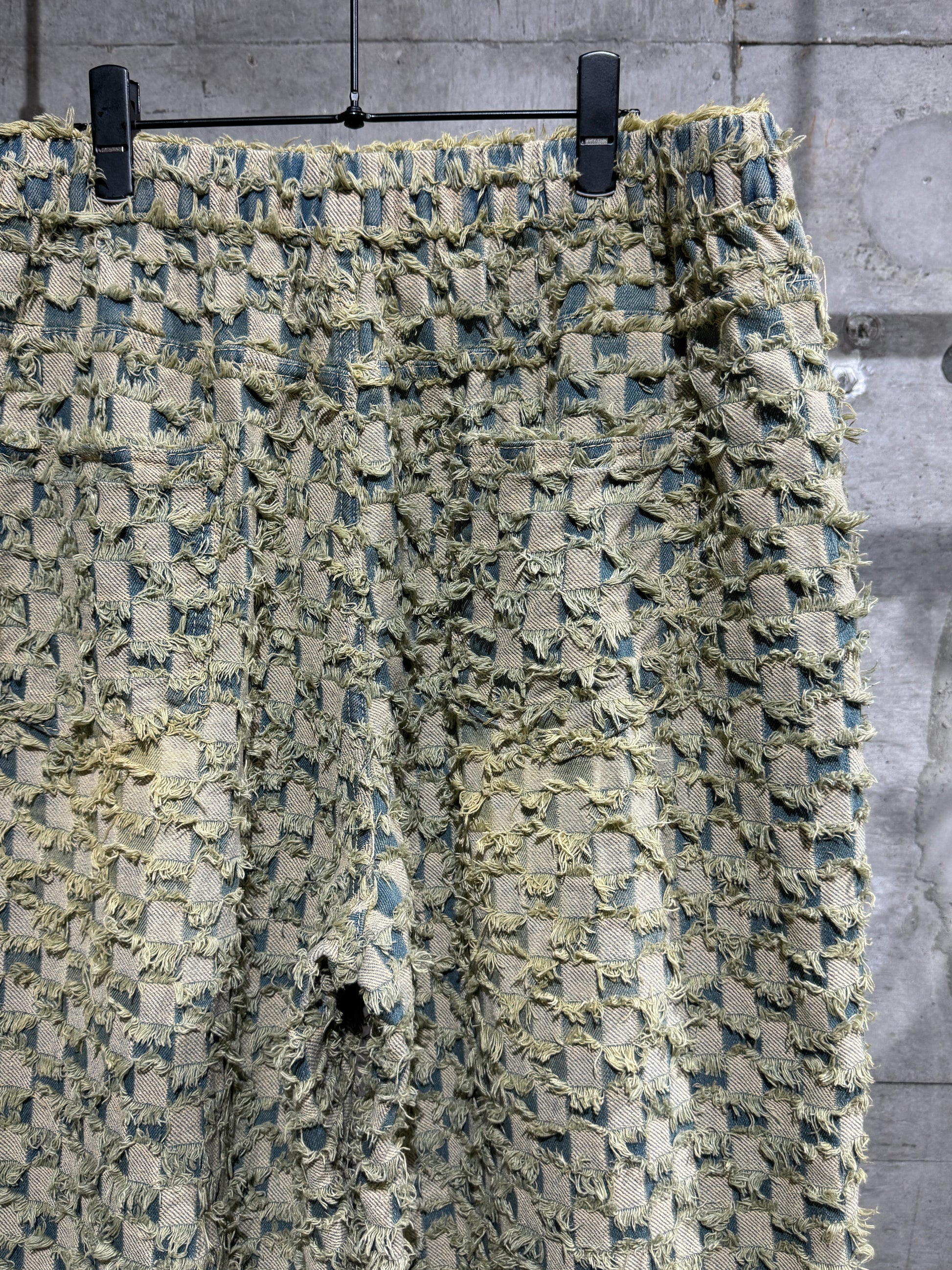 織りの変化で生まれた立体的な格子柄と、ラフなフリンジ加工。
