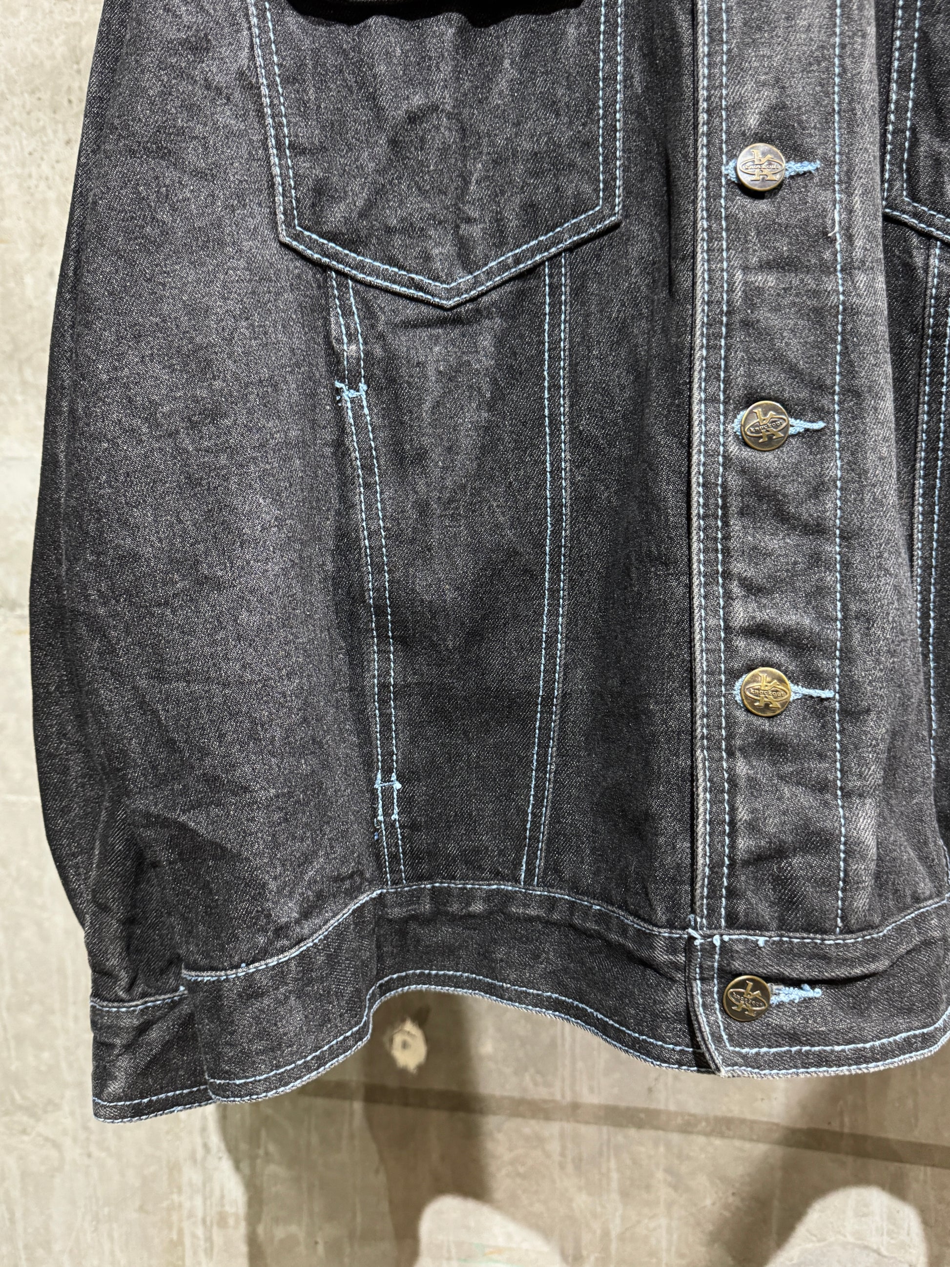 ブラックデニムのボディに、軽快なライトブルーのステッチがアクセントになっています。