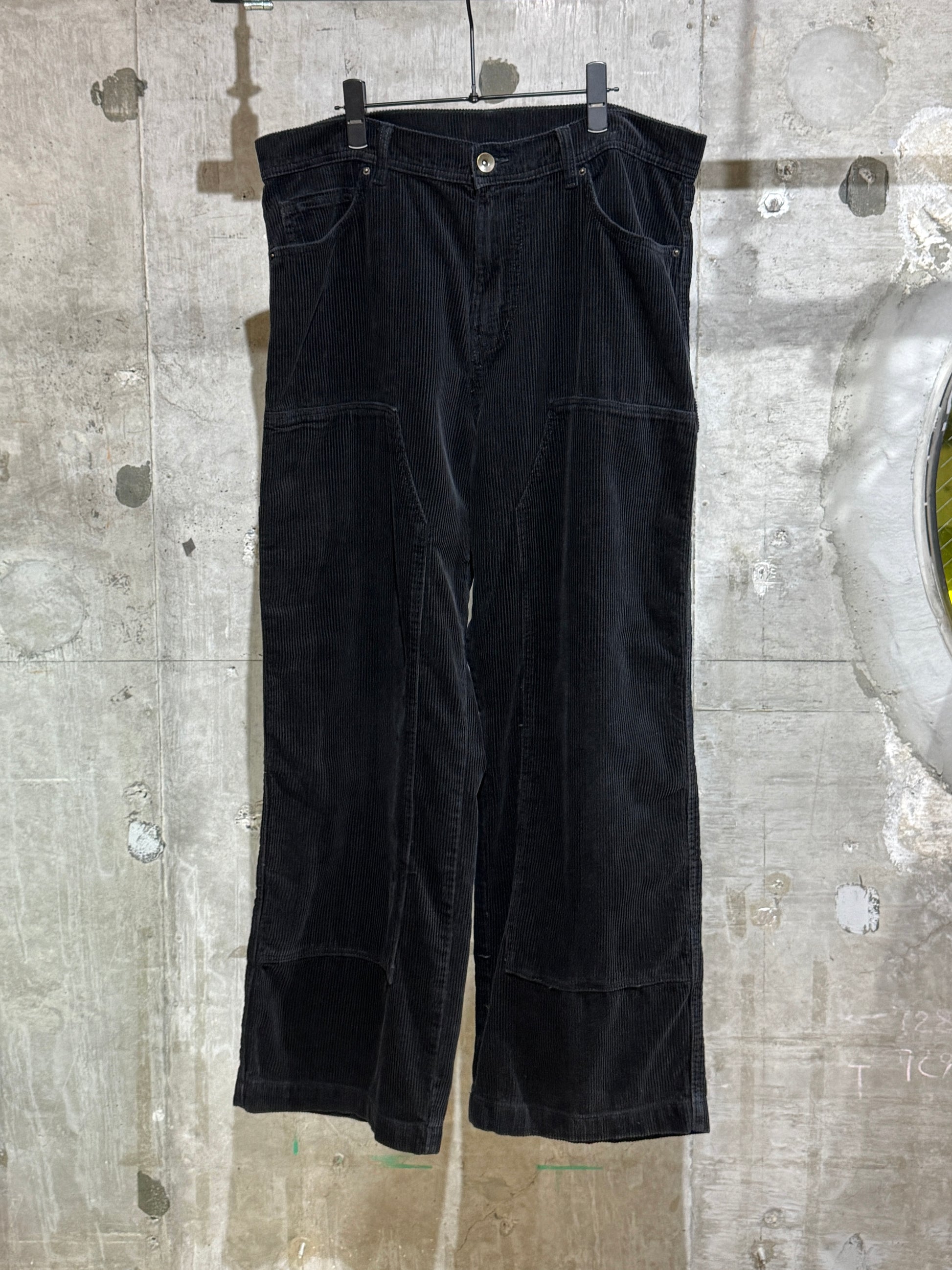 黒いコーデュロイのワイドパンツ。