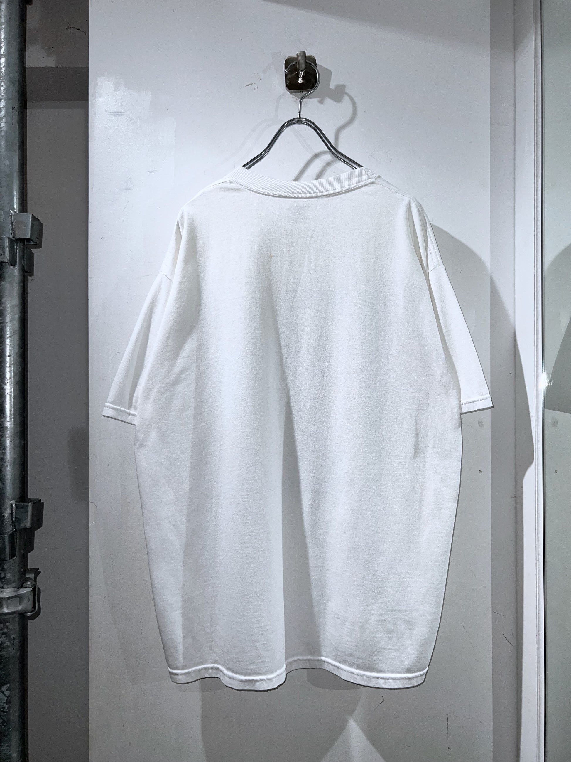 白いボディにロイヤルブルーで描かれたコミック調のグラフィックTシャツ。